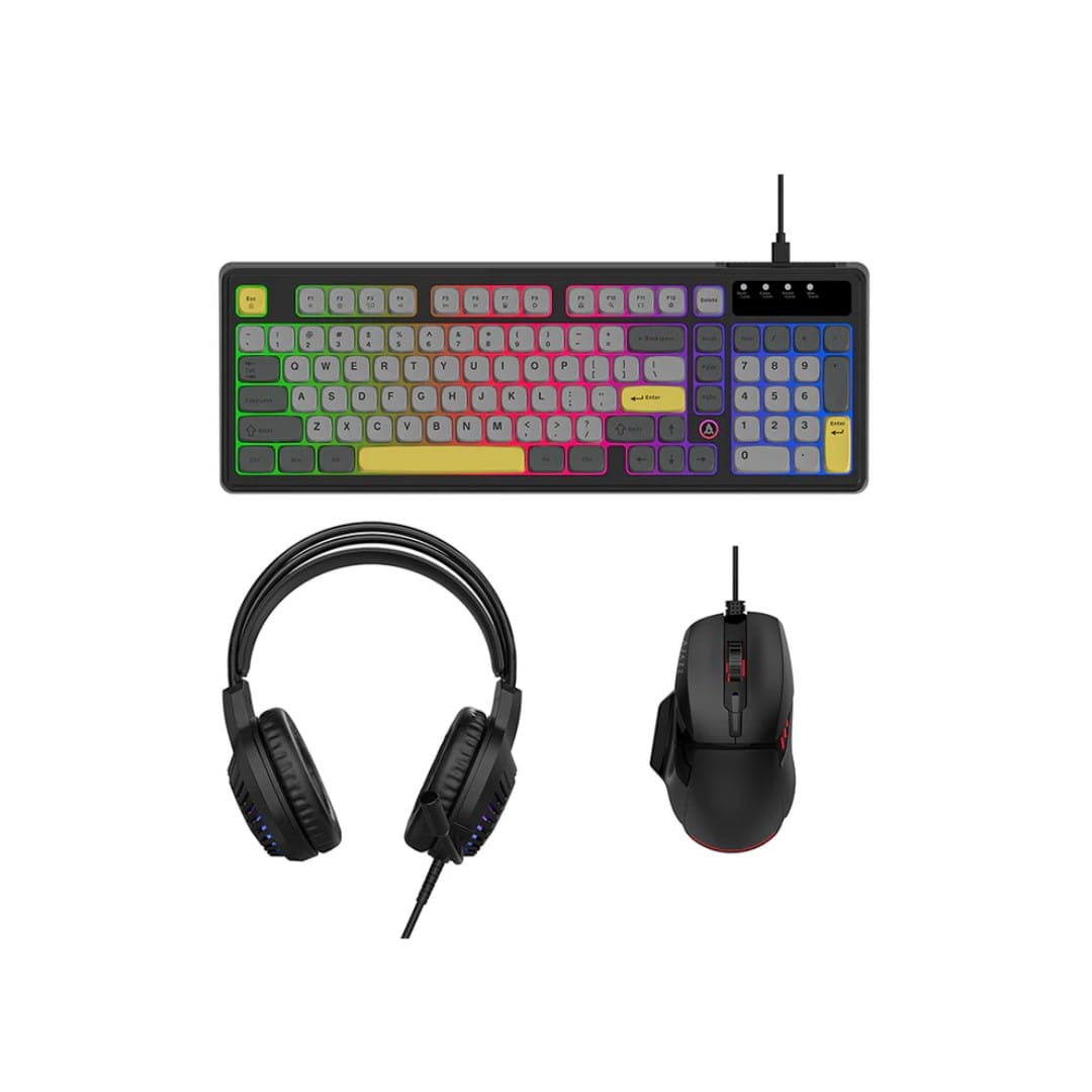 AJAZZ AT120 yra pilnas laidinis PC komplektas, skirtas žaidėjams ir kasdieniam naudojimui. Komplektą sudaro 97 mygtukų kompaktiška klaviatūra, ergonominė laidinė pelė ir patogios over‑ear ausinės. Visos dalys pagamintos naudojant ABS injekcinį liejimą, užtikrinantį atsparumą ir ilgaamžiškumą.