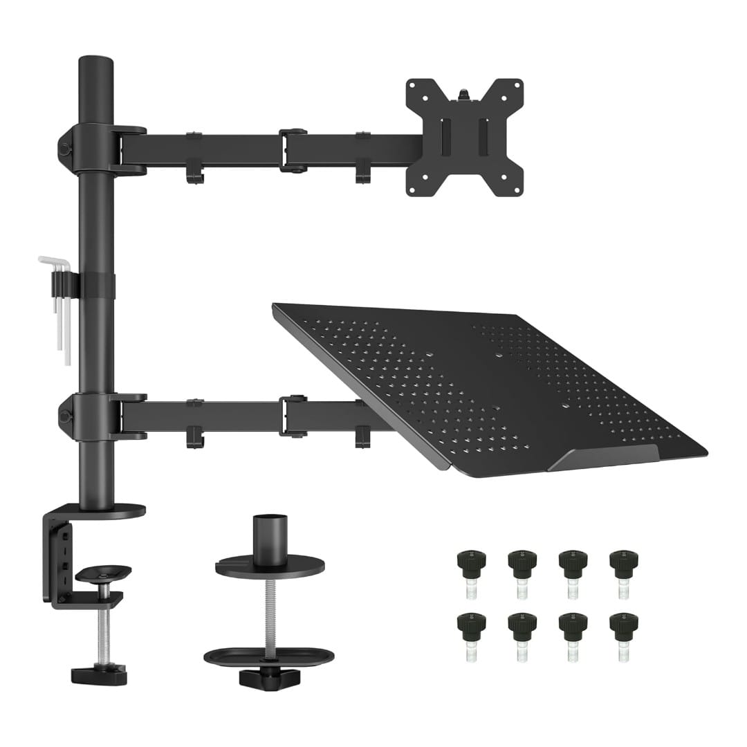 Ergonomiškas dvigubas laikiklis, skirtas vienam monitoriui (13-27″) ir vienam nešiojamajam kompiuteriui (iki 17″). Reguliuojamas aukštis, posvyris ir pasukimas užtikrina patogią darbo vietą ir taupo vietą ant stalo.
