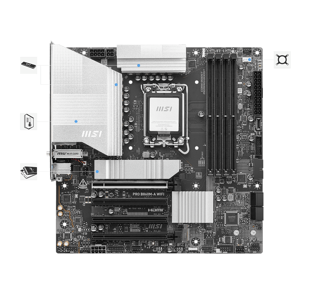 PRO B860M-A WIFI pasižymi paprastu dizainu ir harmoninga sidabrine spalvų gama, kuri puikiai dera tiek prie baltų, tiek prie juodų kompiuterių korpusų. Ji sukurta su daugybe išskirtinių MSI funkcijų, užtikrinančių aukščiausią našumą ir patogumą.